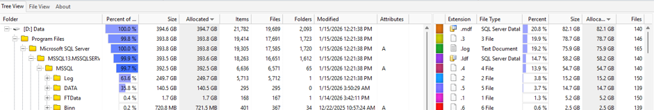 The client noticed the D (data) drive was running out of free space and they asked us to investigate. We found that the SQL Logs folder was much larger than we’d expect. A considerable amount of this data was not database files (.mdf, .ldf, .ndf), but rather log files (.log and anything with a .Number file extension):