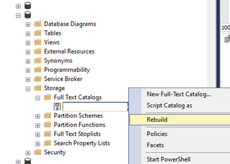 The first thing we want to do is to rebuild our Full-Text catalogue for the affected database. You can easily do this in SSMS: