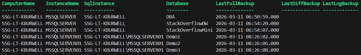 One simple command and I get the same info, plus details for latest diff and log backups as well. Now let’s make a couple of changes so we can get results for multiple instances and make the output a little more friendly.